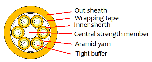 4-48 core branch optical cables (900ym compact buffer fiber, aramid yam is a reinforcement element, 2.0mm innelsheath) are used as a subunit. A fiber-reinforced plastic (FRP) is positioned at the center of the core as a non-metallic strengthening element. The subunit is surrounded by FRP, with a PVC or LSZH material sheath, and the final outer layer is polyvinyl chloride (PVC) or low-smoke halogen-free material (LSZH, low smoke, halogen-free, flame retardant jacket).